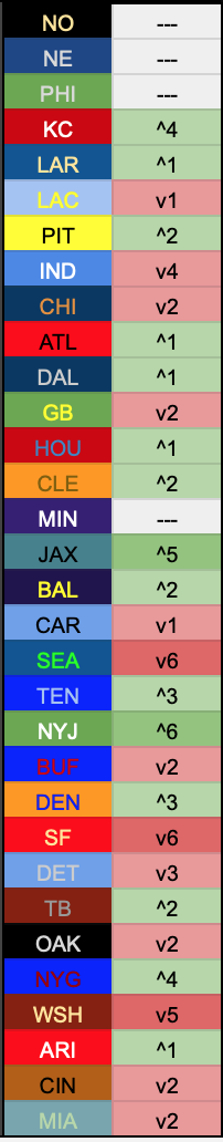 Meanwhile injuries force Washington, San Francisco, and Seattle down the chart. I’m not entirely sure on the Saints being top of the league but I’ll be damned if I’m putting the Patriots at #1 if I don’t have to.