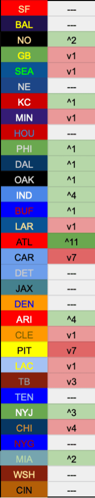 The eliminated Bengals stay last and the 49ers survive injuries and a strong challenge from an up and coming division opponent to keep the top spot. Most movement comes from the confusing NFC South, where the Falcons and Panthers close what was a 17-spot gap between them and the Saints regain my confidence to jump the Seahawks and Packers on those teams’ bye weeks. the Colts and Steelers also move, albeit in different directions, after proving me wrong in divisional games.