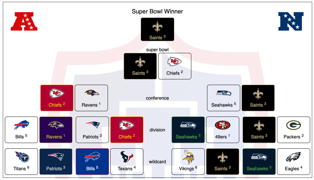 Round 1 the 4 seeds fall and the 3 seeds hold. In the AFC we get chalk in the championship but the Chiefs outsmart the Ravens again and get to the Super Bowl. In the NFC the Seahawks translate their chagrin at the way their regular season ended into a couple of close wins before a close loss in New Orleans. Drew Brees gets a ride-into-the-sunset finish and Michael Thomas becomes the first non-Steeler to win super bowl MVP as a wide receiver.