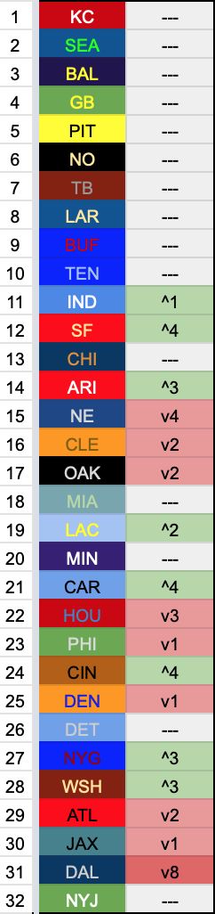 The whole top ten stays! So tempting to put Dallas in the bottom spot but that might just be a little too reactive.