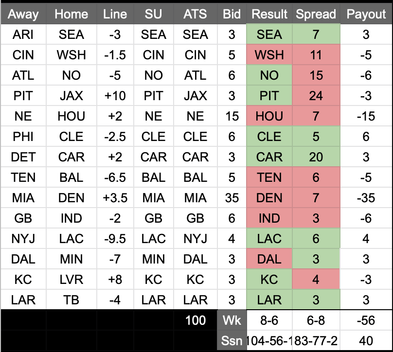 I am super aware that Kenny Golladay didn’t suit up, because I didn’t have time to take him out of my lineup, but even so it is hilariously unacceptable to have been shut out in this game. Props to PJ Walker who is now a combined 7-0 in the AAFL and NFL. - Titans over Ravens in OT
