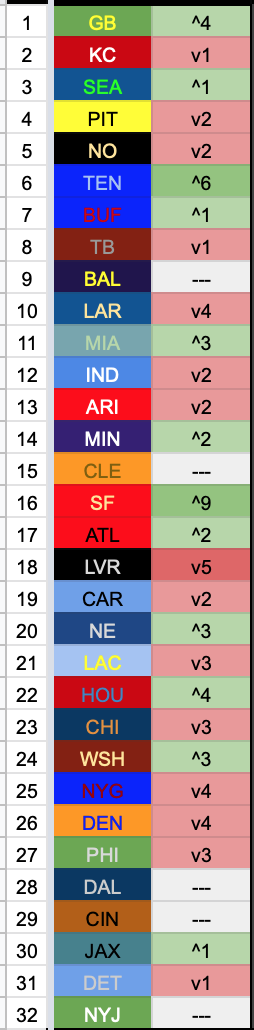 The Titans bullied their way back into the top 10 and the Niners fought for a middling spot, but the big new thing is that the Packers are on top! They’ve had more dud weeks than the Steelers and Chiefs, but they’re more impressive when they’re at their best, and mostly I just hate KC and Pittsburgh.