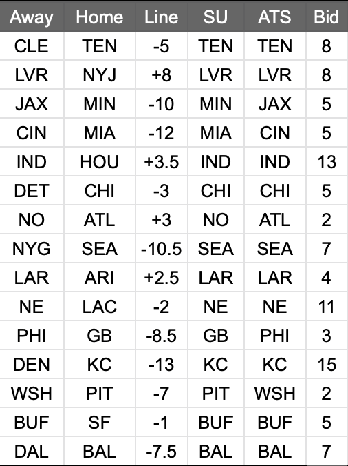 Needles: MIN/JAX, MIA/CIN, NO/ATL, GB/PHI, PIT/WSH