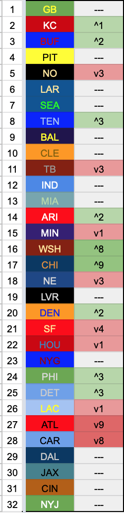 The Team and the Chicagos move up, the Bears because they like to torment me, and the Washingtons because they are gonna go to the playoffs somehow.