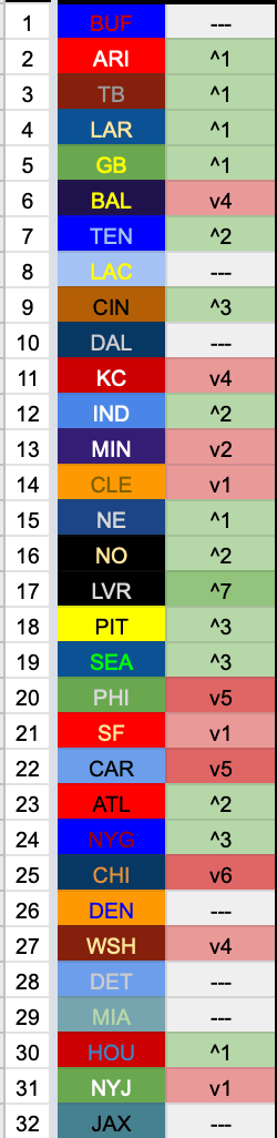 The top and bottom spots were on bye this week, but the whole order from 2-6 accommodates a drop by the previous #2 Ravens. The Bengals kick the Chiefs out of the top 10. Further down, I give up hope on the Bears, Panthers, and Eagles, while the only big riser of the week is the Raiders.