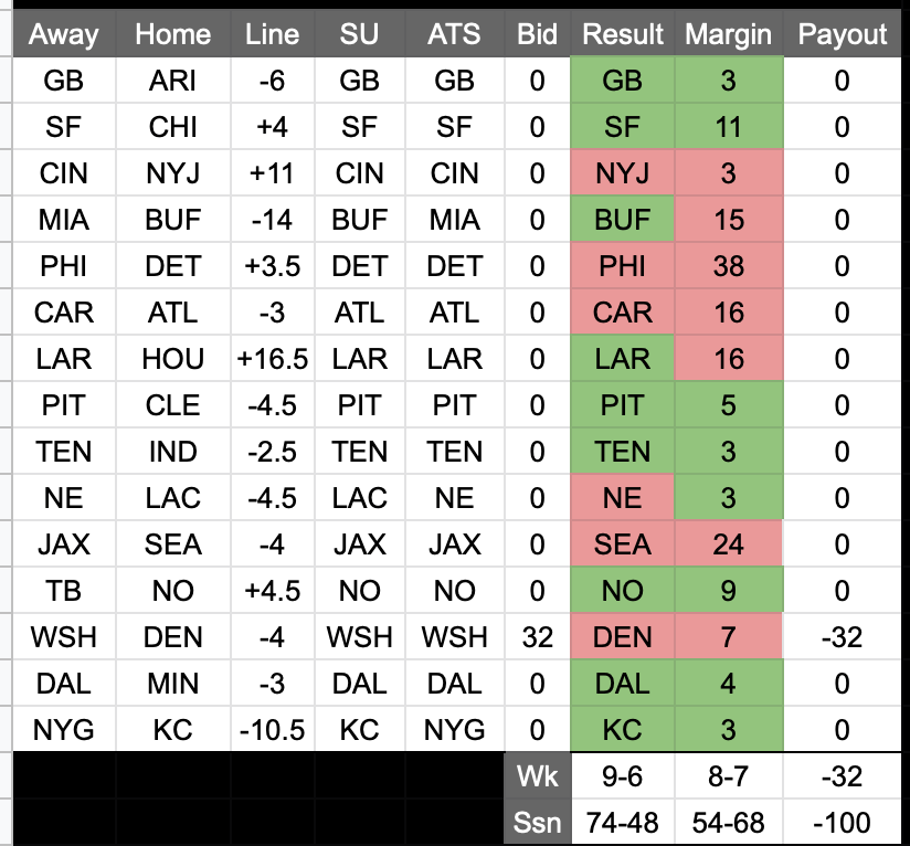What a week to decide the Lions are due for a win. 0-17 seems increasingly on the table. Of course, just about every season a team emerges that you must can’t see winning a game, and they always do. Er, almost always… - Panthers over Falcons