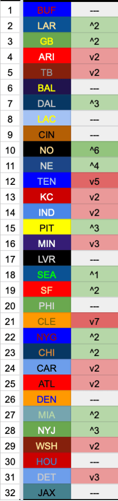 Buffalo’s performance wasn’t exactly inspiring but not flat enough to lose them the rankings crown this week. The Rams and Packers leapfrog the Cards and Bucs into the top 3. The Titans virtually wrap up their division but fall out of the top 10 due to the loss of Derrick Henry, leaving room for the Saints to sneak in, with the Patriots on their heels. The Browns are the only other big droppers, with Detroit falling to #31 but not overtaking the completely uncompetitive mess that is the Jaguars.