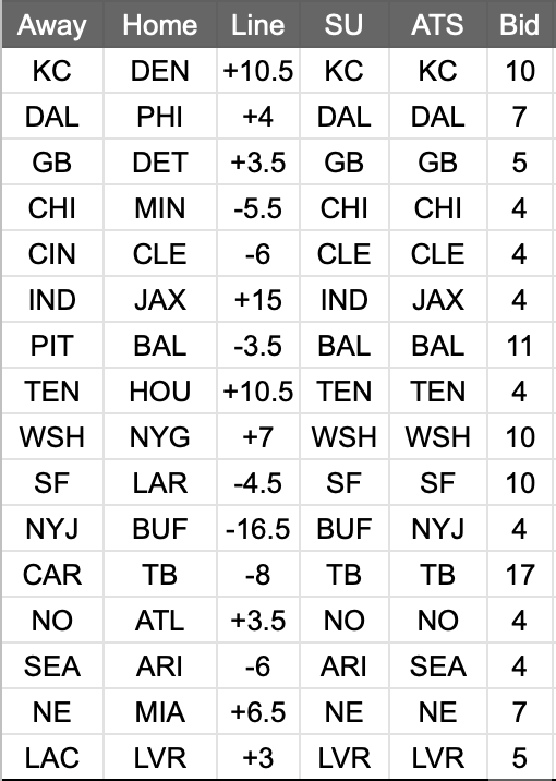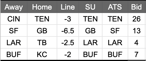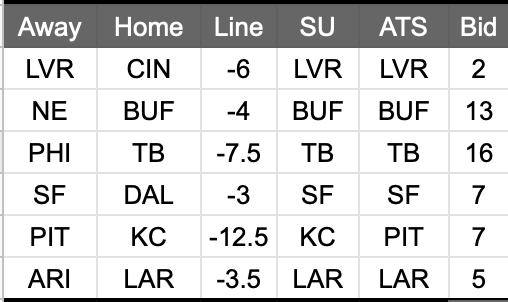 Survivor: SF, DEN, CAR, TB, DAL, IND, NE, CIN, BAL, LAR, CLE, BUF, MIA, TEN, ARI, PHI, GB, KC