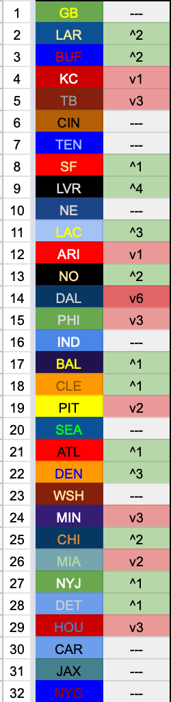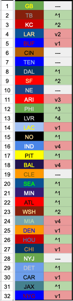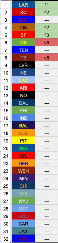 Again no huge moves, and Green Bay keeps top spot despite losing because it was Jordan Love hours. However, Arizona leaves the top 10 and the Giants go into the offseason dead last, seeing as they have no real path to getting better, as opposed to the Jags, Jets, and Lions (though maybe not the Panthers and Texans). The steelers will play next week but that doesn’t make them better than the Chargers, Saints, and Colts.