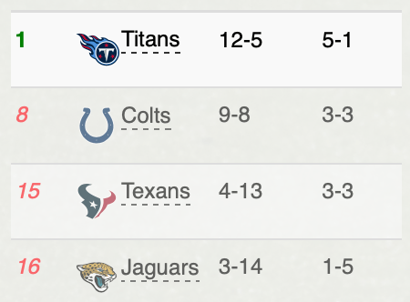 The Texans and Jaguars were as shit as expected — though I think at the beginning of the season a lot of people would have thought the Jags were the one with a promising roster that could be surprisingly competent if not very prolific. I think we have to accept that Vrabel is just a good head coach and the reason the Titans are good. The Colts blew it so hard, one imagines how things could have turned out if they didn’t start the season with a clandestine 0-5 streak.