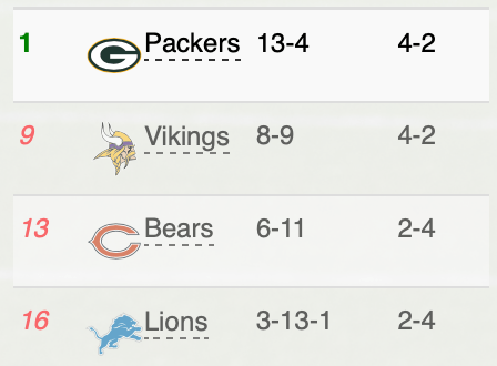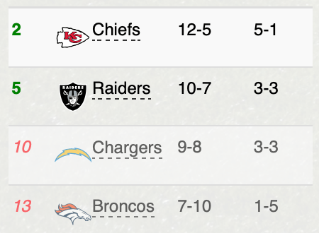 Still showing the whole league because even the dead teams are changing. Houston gets rid of a coach who led them to 4 more wins than the roster deserved. Dallas and Pittsburgh embarrassed themselves and took their rightful place below several non-playoff teams. The Raiders move into the top 10 in a loss, but I don’t know whether to move them down or up if they abandon Carr or Bisaccia.