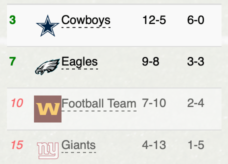 Not a shock that the Cowboys won the division, nor that the Giants are ass. Somewhat of a shock that the Eagles made the playoffs and the Washingtons suck.