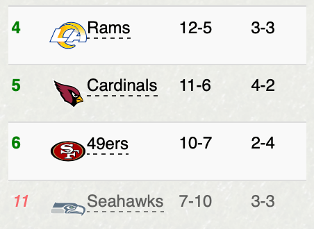 Seems poetic somehow that every team other than the Seahawks made the postseason out of this division. Very impressive by Arizona to stumble all the way out of at least the 2 seed.