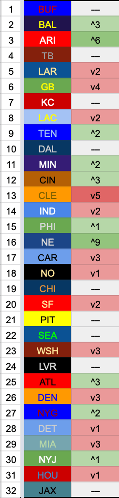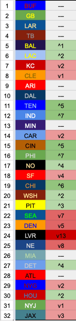 I’m keeping Buffalo on top after a close and fluky loss on a major Derrick Henry day. And I’m keeping Jacksonville at the bottom after a close and fluky win in an international game.