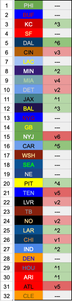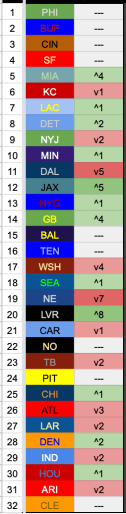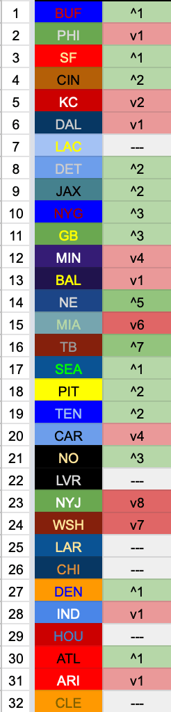 Stairway to Heaven: PHI, MIN, SF, BUF, KC, DAL, CIN, BAL, LAC, NYG, TB, JAX, MIA, SEA