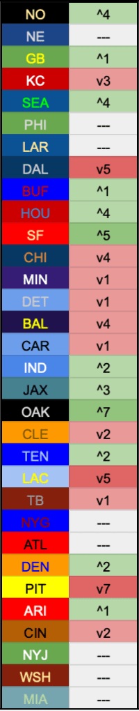 Meanwhile injuries force Washington, San Francisco, and Seattle down the chart. I’m not entirely sure on the Saints being top of the league but I’ll be damned if I’m putting the Patriots at #1 if I don’t have to.